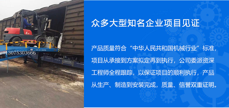 >> 13年的登車(chē)橋設(shè)備制造經(jīng)驗(yàn) 集設(shè)計(jì)、研發(fā)、生產(chǎn)和銷(xiāo)售于一體的制造型企業(yè),專(zhuān)業(yè)制造液壓登車(chē)橋,移動(dòng)式登 車(chē)橋和高空作業(yè)平臺(tái),經(jīng)驗(yàn)豐富,擁有強(qiáng)大的成產(chǎn)技術(shù)和完善的管理模式。 >> 引進(jìn)國(guó)際先進(jìn)施工工藝 配備整套專(zhuān)業(yè)自動(dòng)化生成設(shè)備,引進(jìn)國(guó)外先進(jìn)技術(shù), 定期培訓(xùn),確保設(shè)備的高品質(zhì)。 產(chǎn)品具有設(shè)計(jì)新穎、結(jié)構(gòu)合理、升降平穩(wěn)、載重安全、操作簡(jiǎn)單、維護(hù)方便等優(yōu)點(diǎn)。